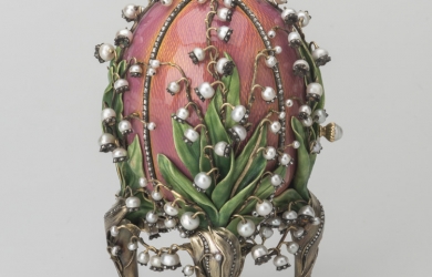 Яйцо "Ландыши" имеет утонченный дизайн с букетом ландышей, выполненных из белой и зеленой эмали, распускающихся из золотого горшка, украшенного бриллиантами. Каждый цветок ландыша имеет золотое основание и представлен с исключительной детализацией и мастерством.