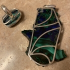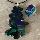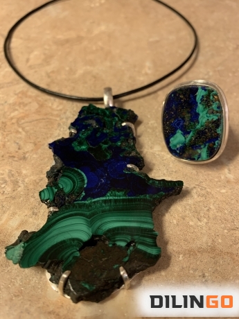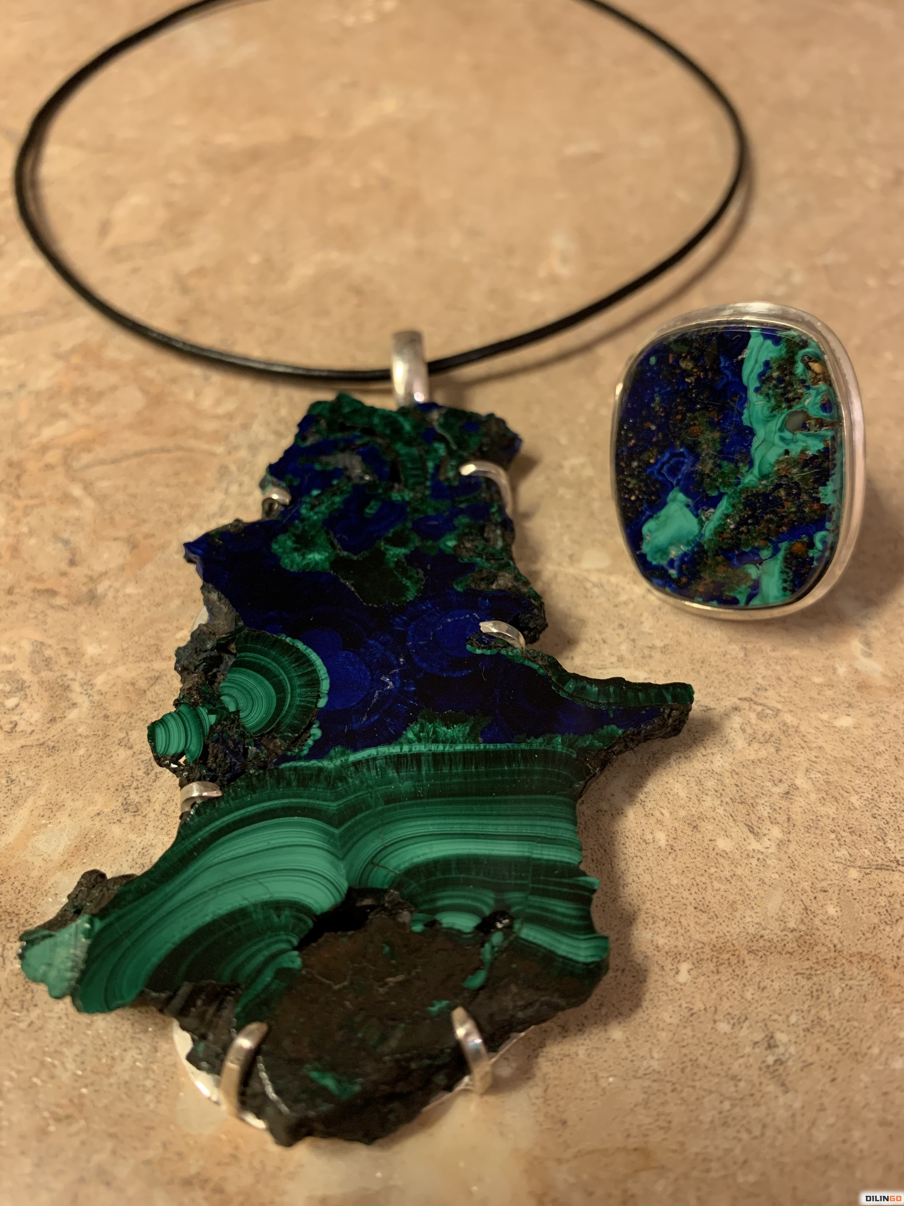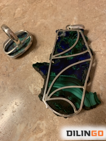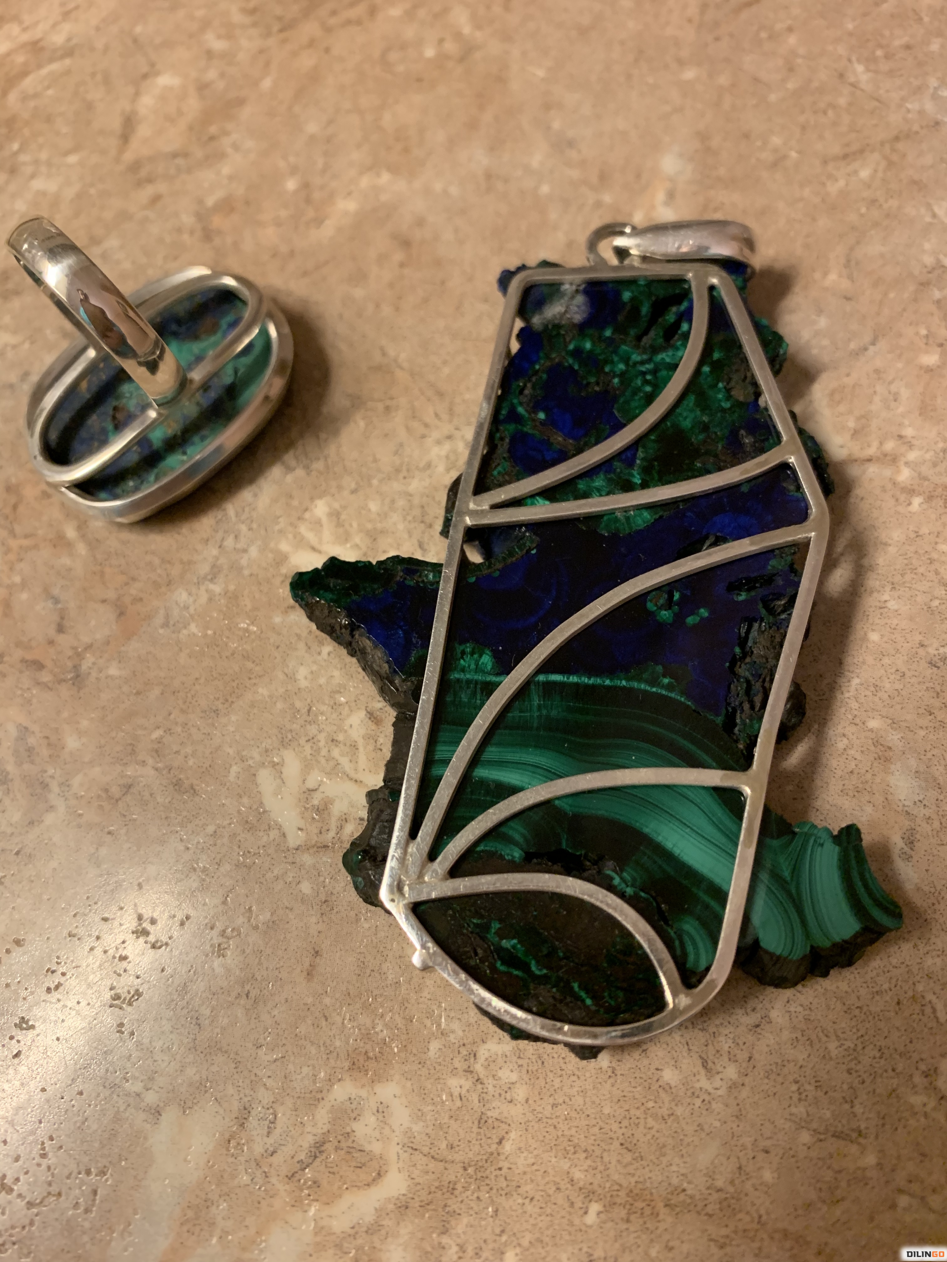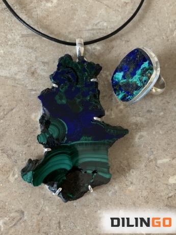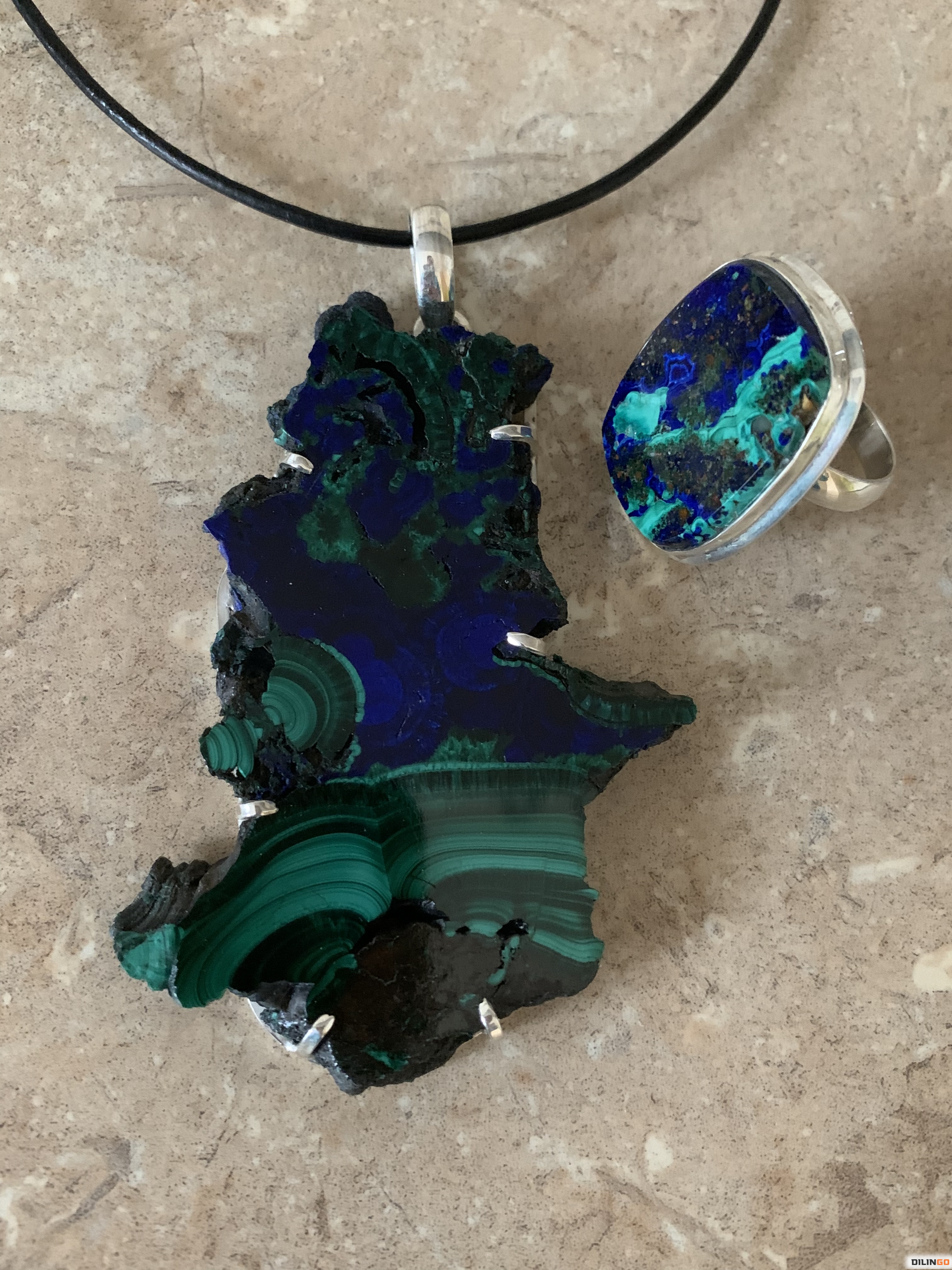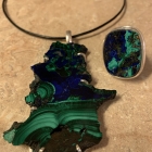 Кулон и кольцо из природного азуромалахита для ценителей необычных украшений. Кулон с живыми краями, фантазийный формы. Длина с петлей из серебра 9 см, ширина 6 см. Кольцо размер 18,5 (в мастерской размер можно подкорректировать под себя). Азуромалахит - это чудесное редкое природное чудо, включающее в себя две породы кружевной малахит и кобальто-синий азурит.