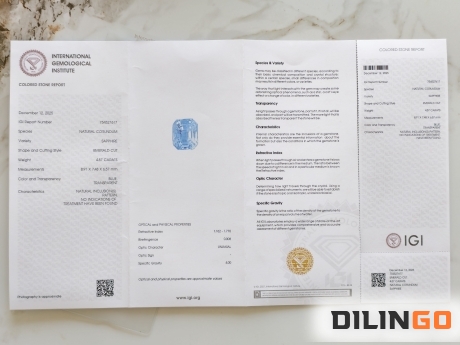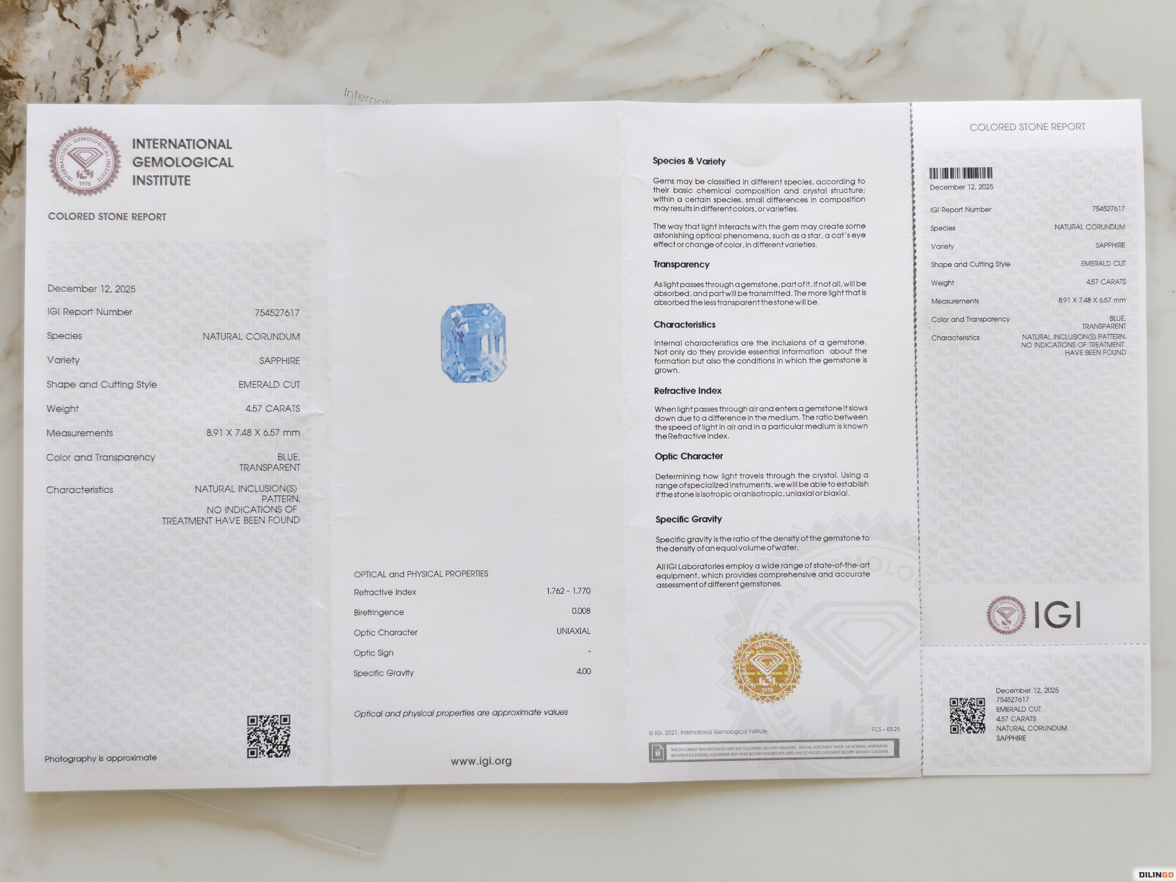 Cапфир высокого качества, подтверждённый сертификатом IGI (International Gemological Institute).