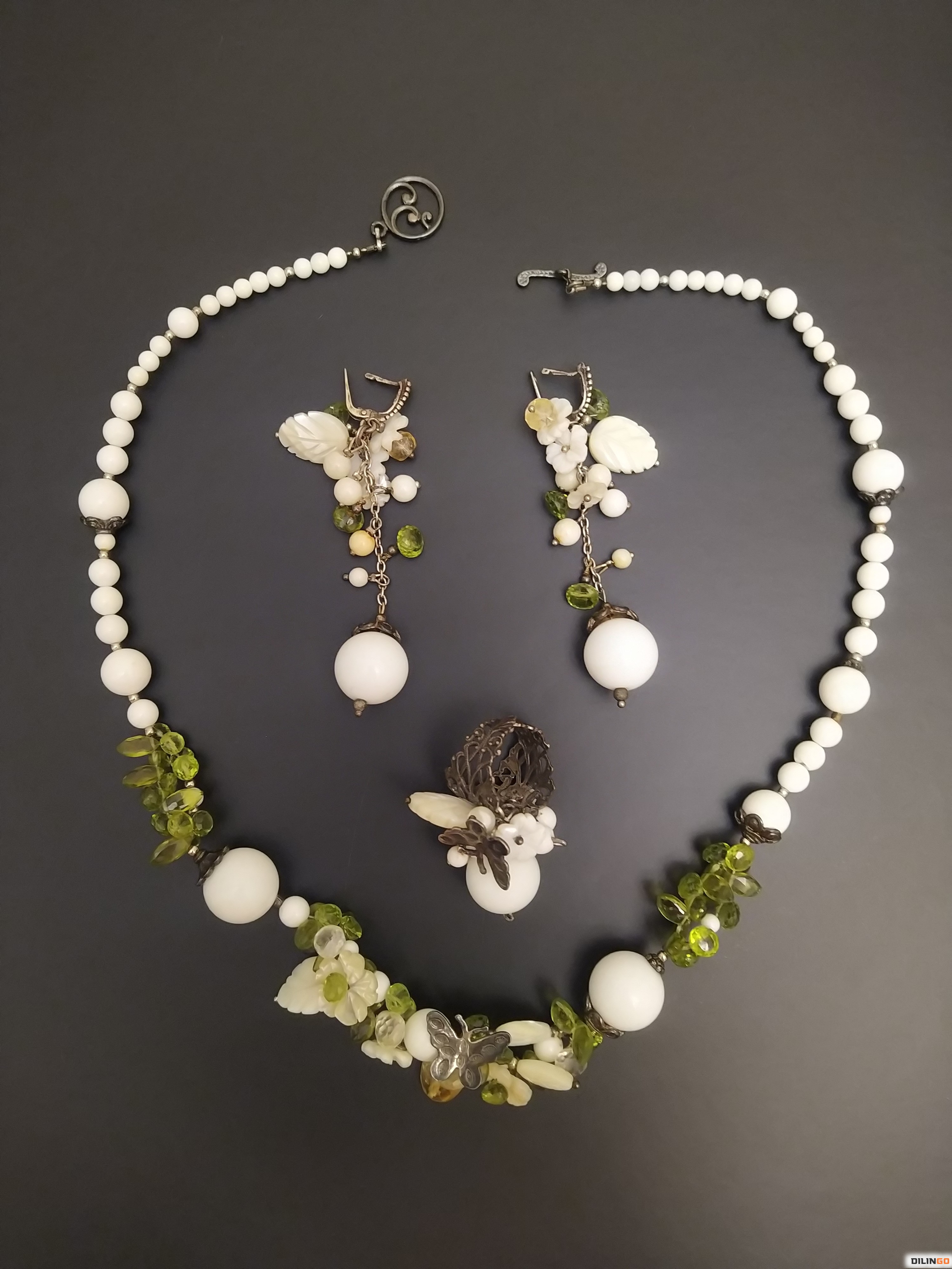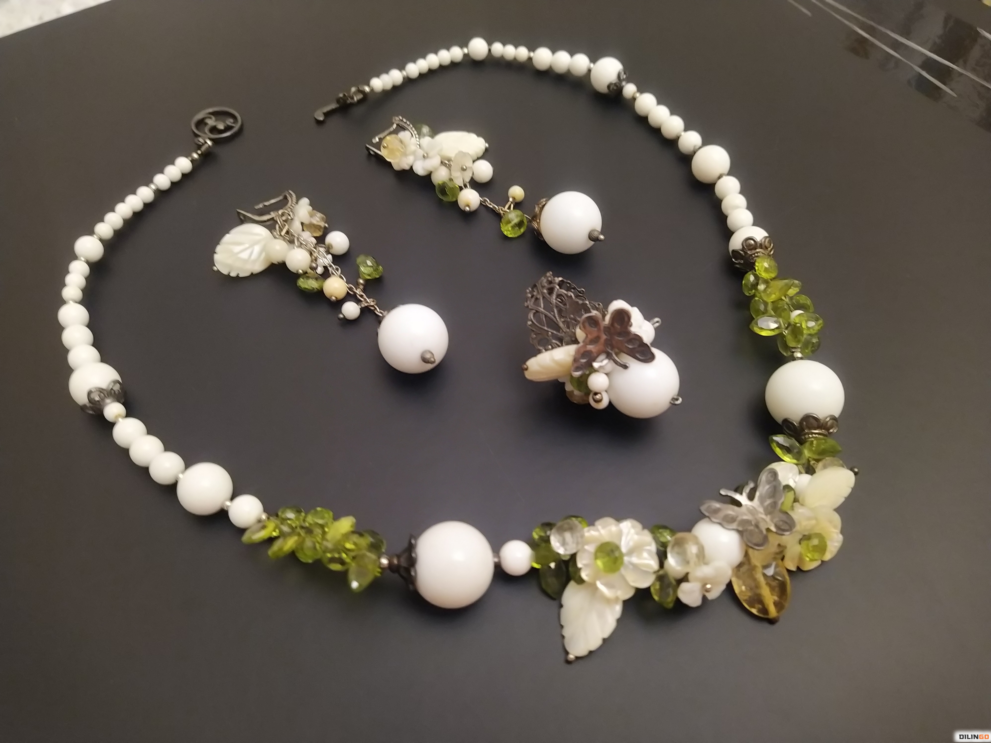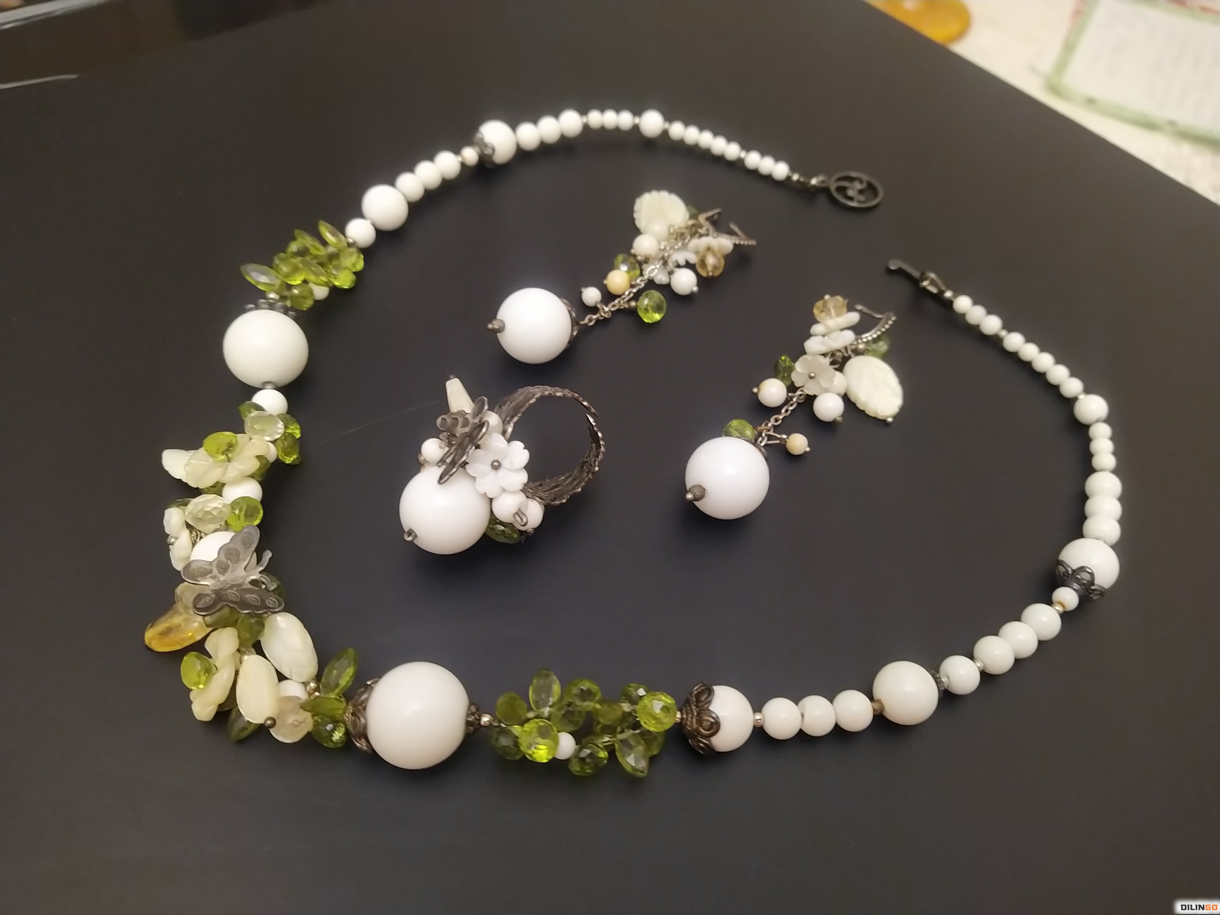 Продаю комплект - бусы, серьги, кольцо. Камень – белый агат с цитринами и хризолитами. На кольце и бусах – бабочки из серебра. Размер кольца регулируемый. Ручная работа. Б/У. В отличном состоянии. Смотрится очень изумительно и дорого.