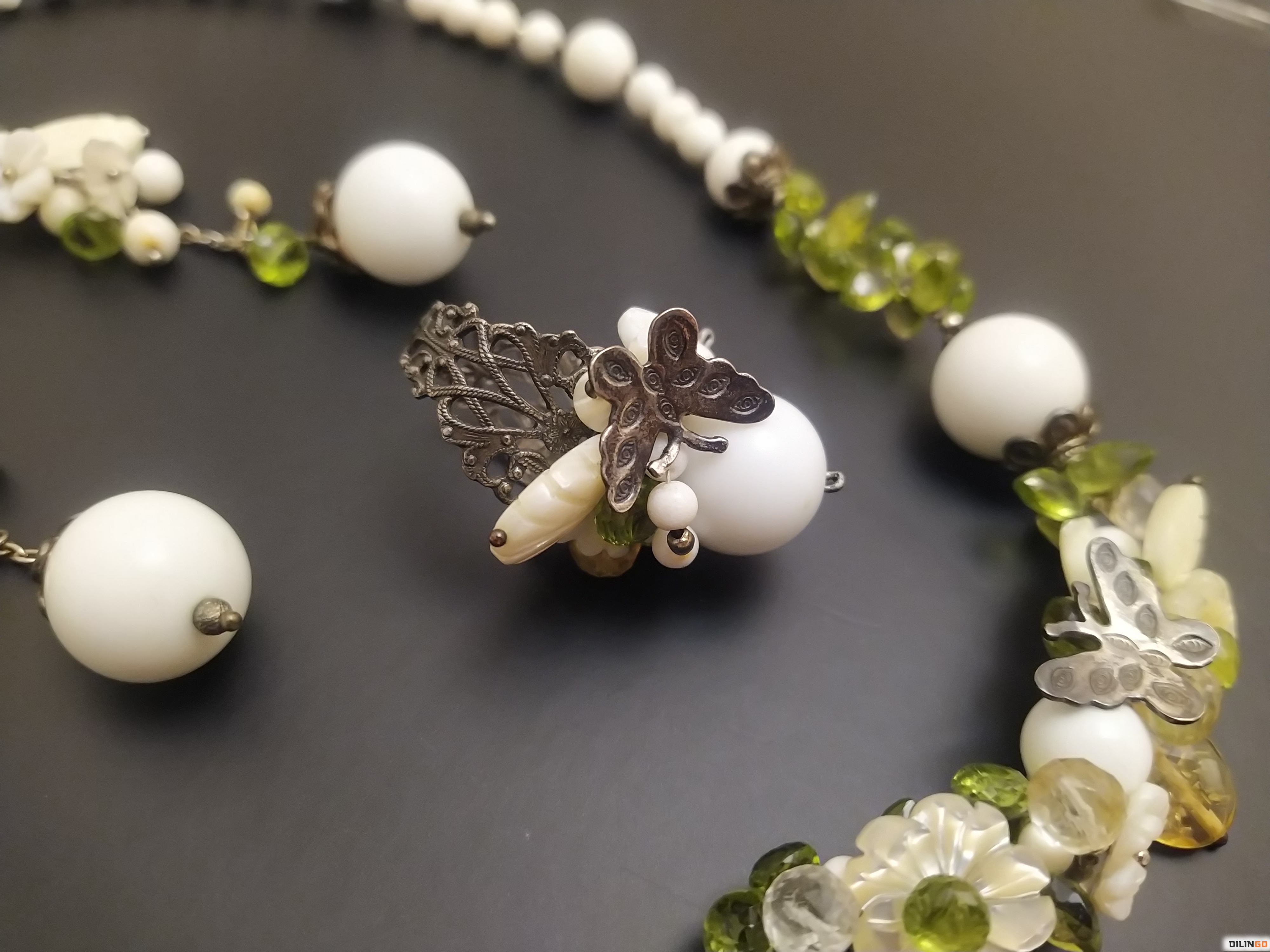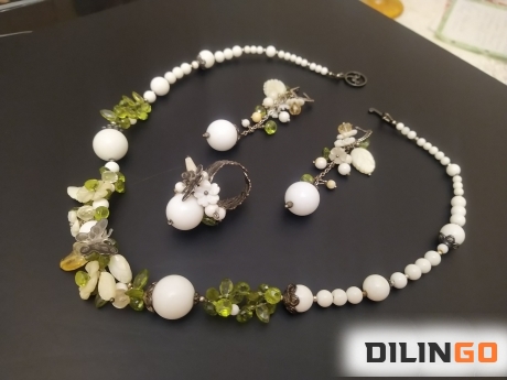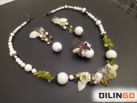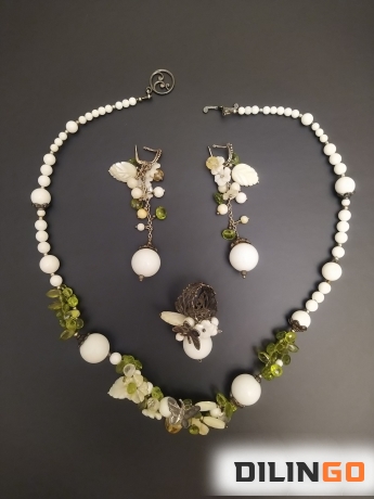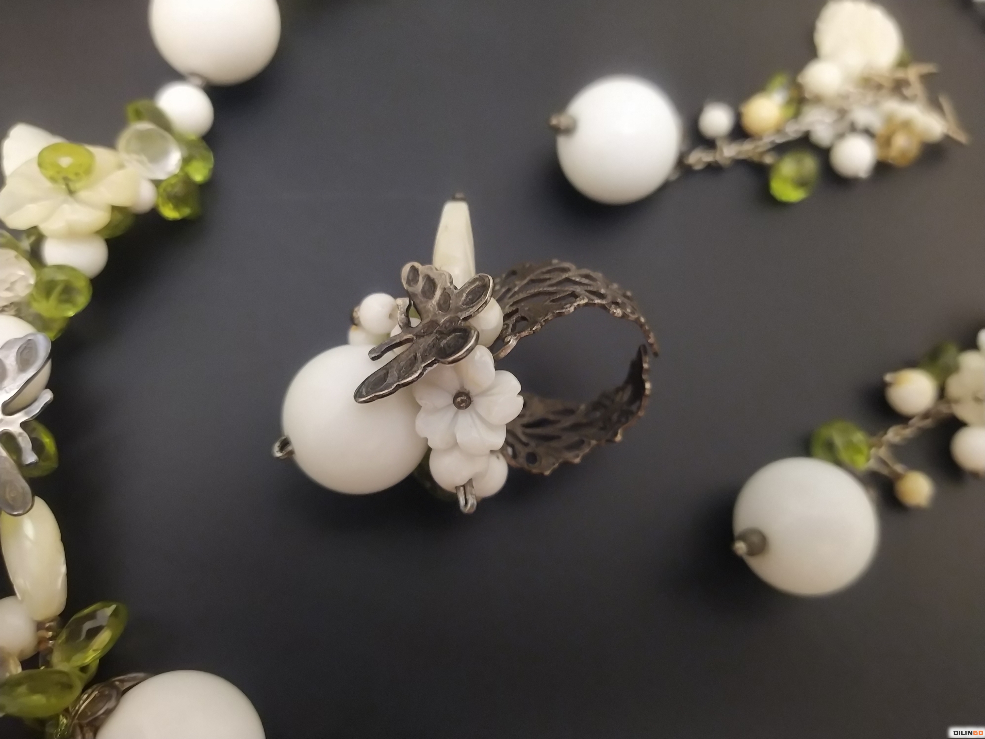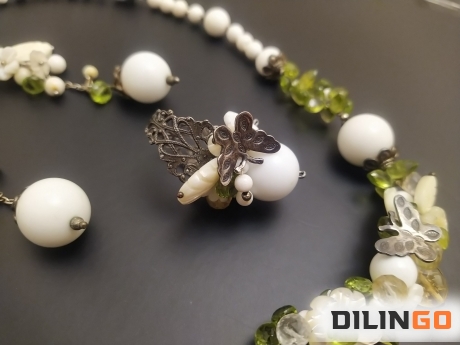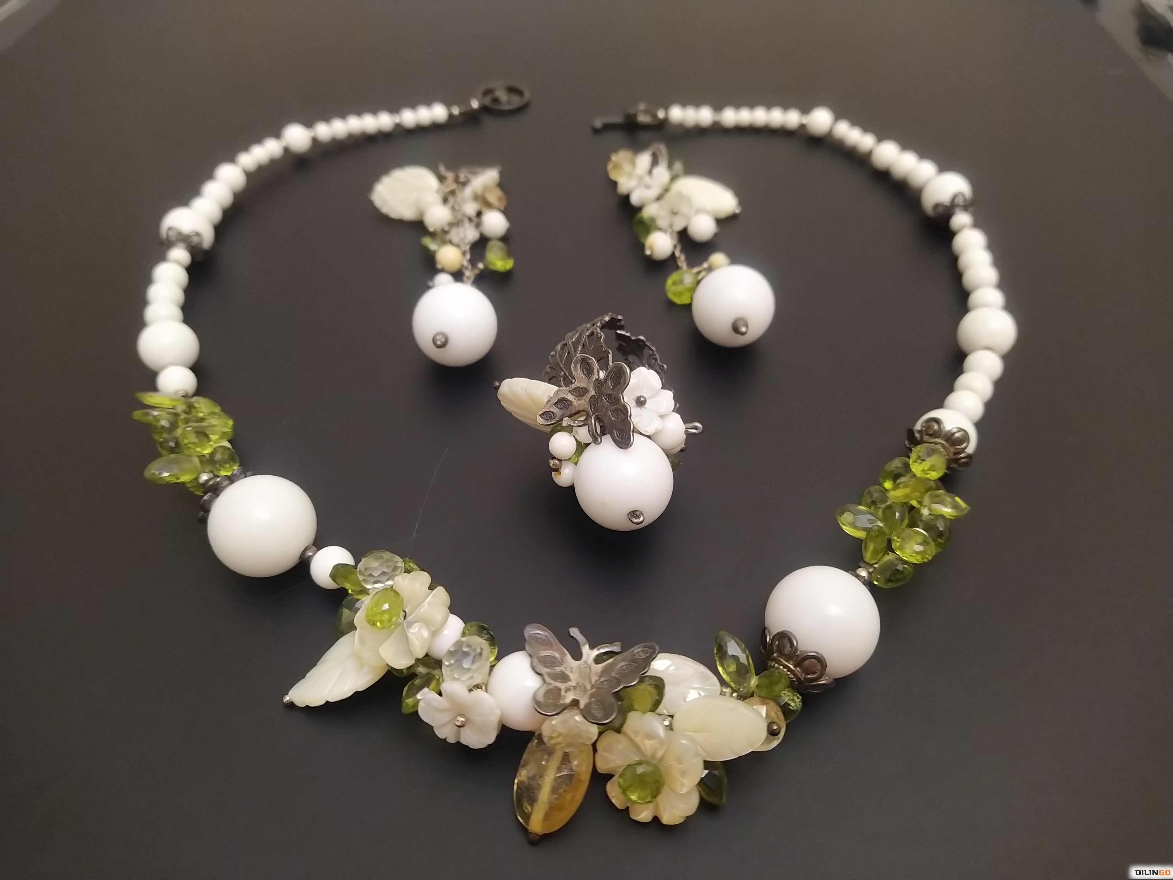 Продаю комплект - бусы, серьги, кольцо. Камень – белый агат с цитринами и хризолитами. На кольце и бусах – бабочки из серебра. Размер кольца регулируемый. Ручная работа. Б/У. В отличном состоянии. Смотрится очень изумительно и дорого.