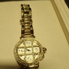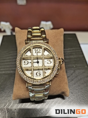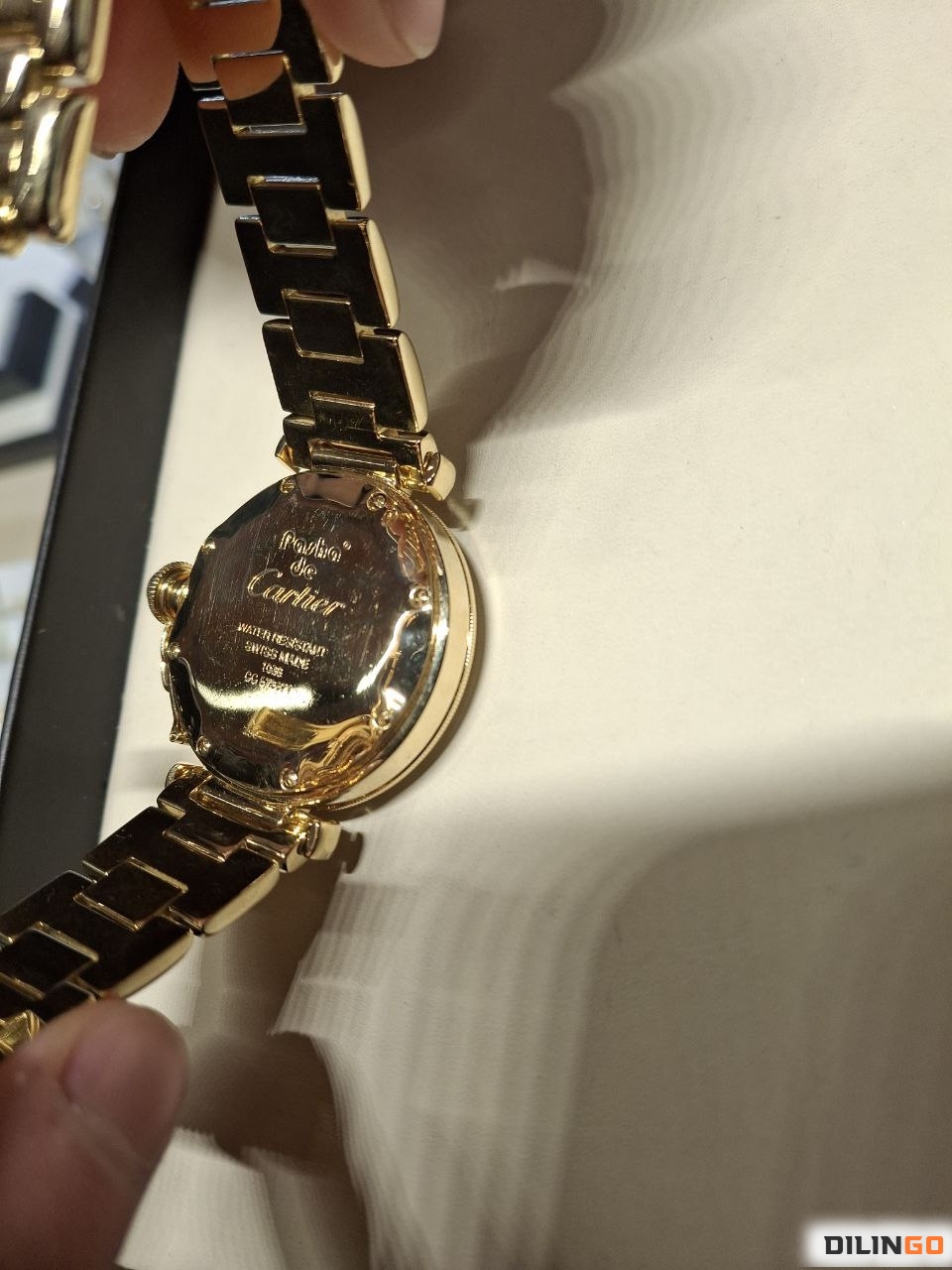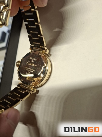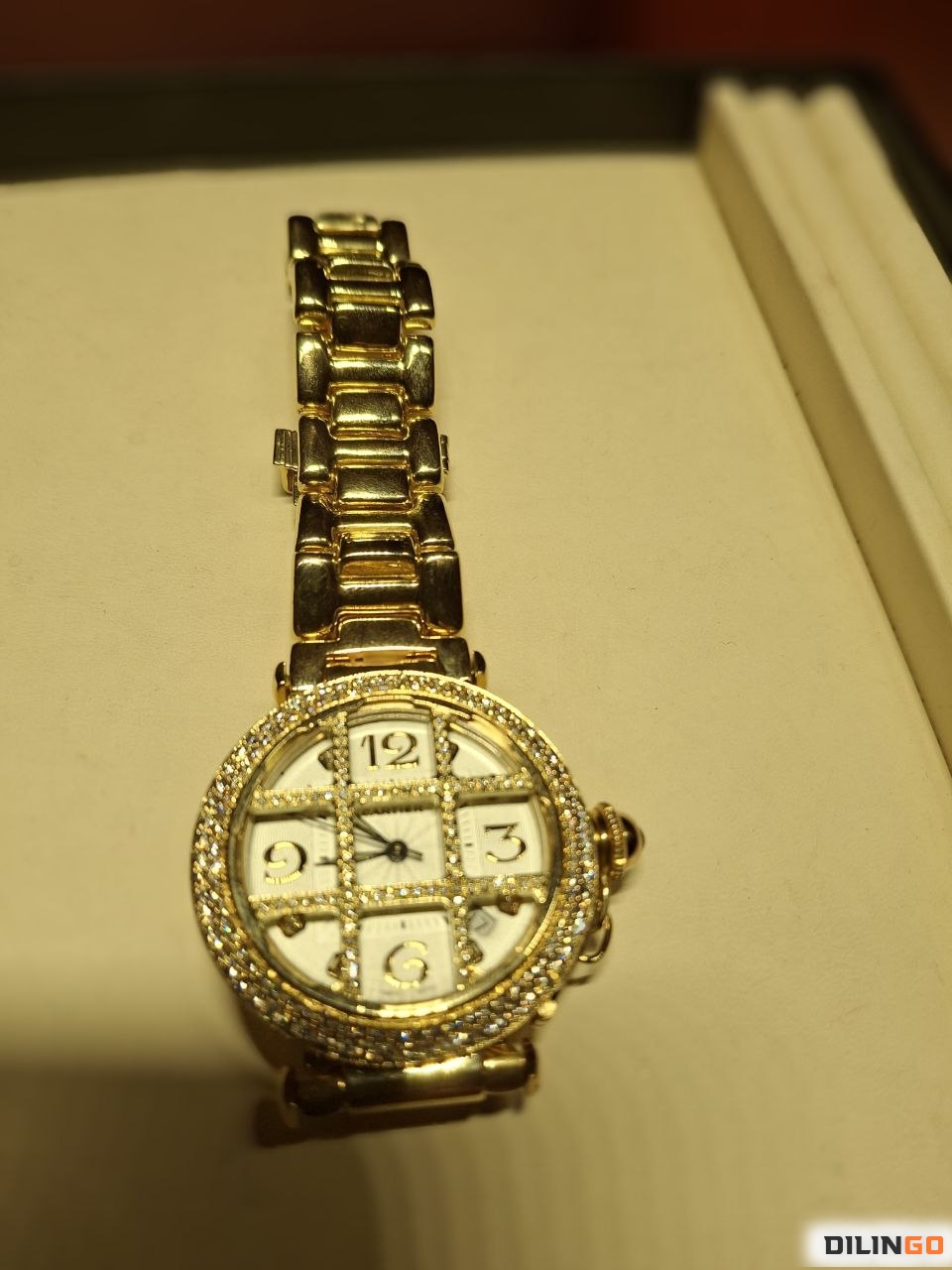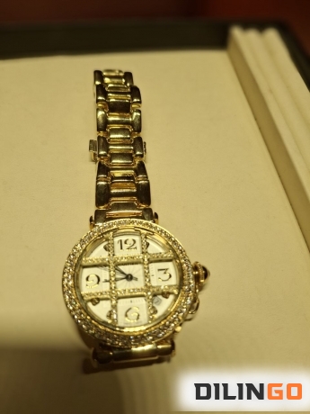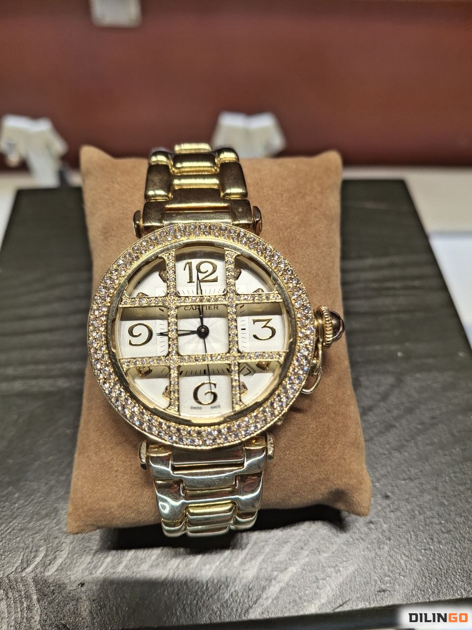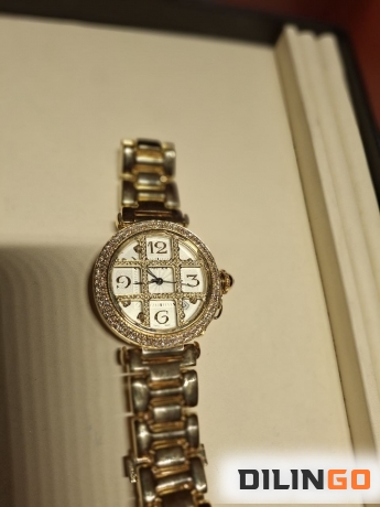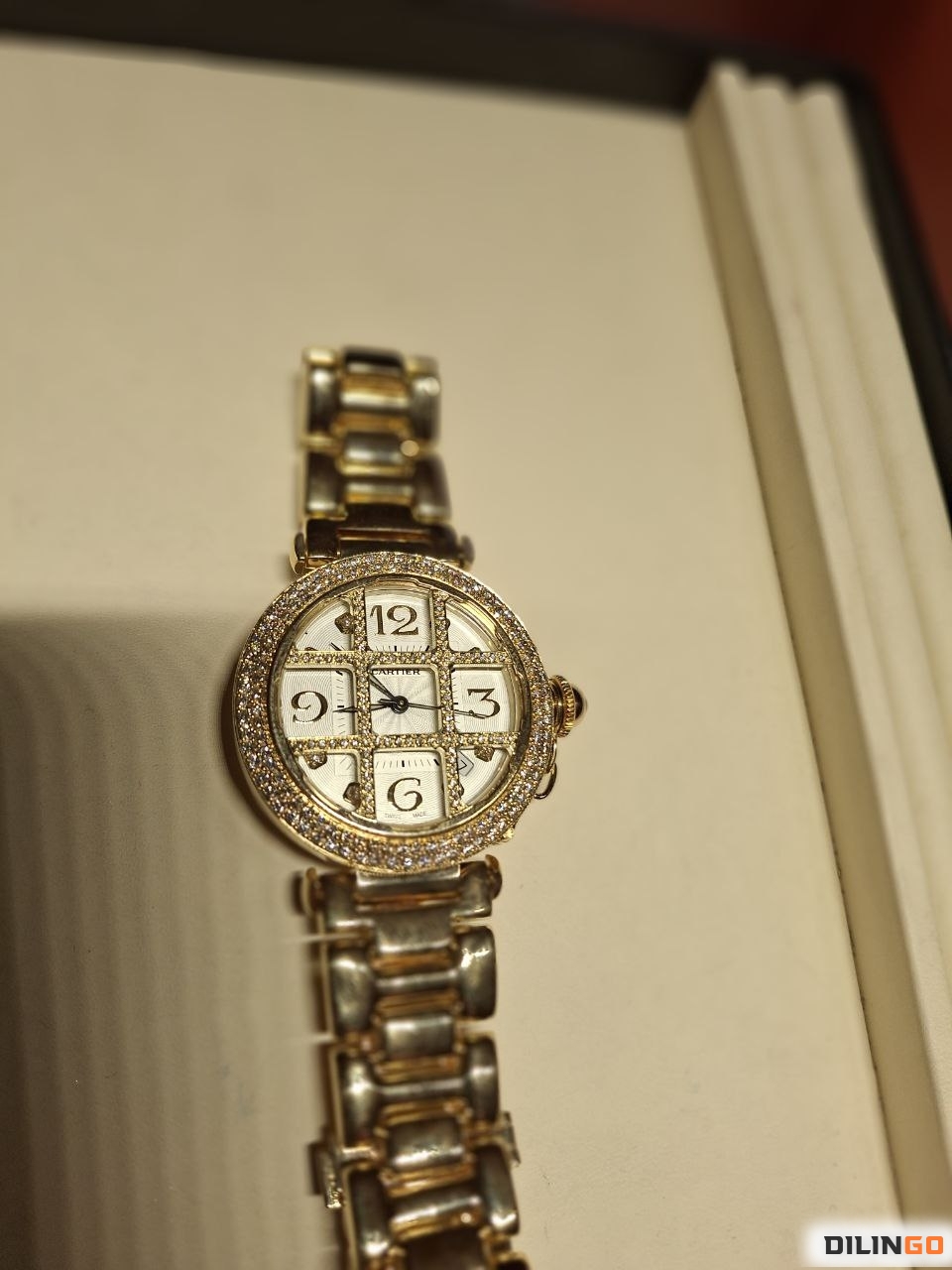 Часы Cartier - реплика. Корпус-золото 750 пробы. Обрамление - бриллианты. Решетка с бриллиантами съемная. На кнопке механического подзавода - сапфир. На золотом браслете 750 пробы. Механизм номерной швейцарский, подлинный.