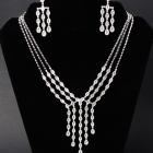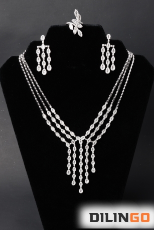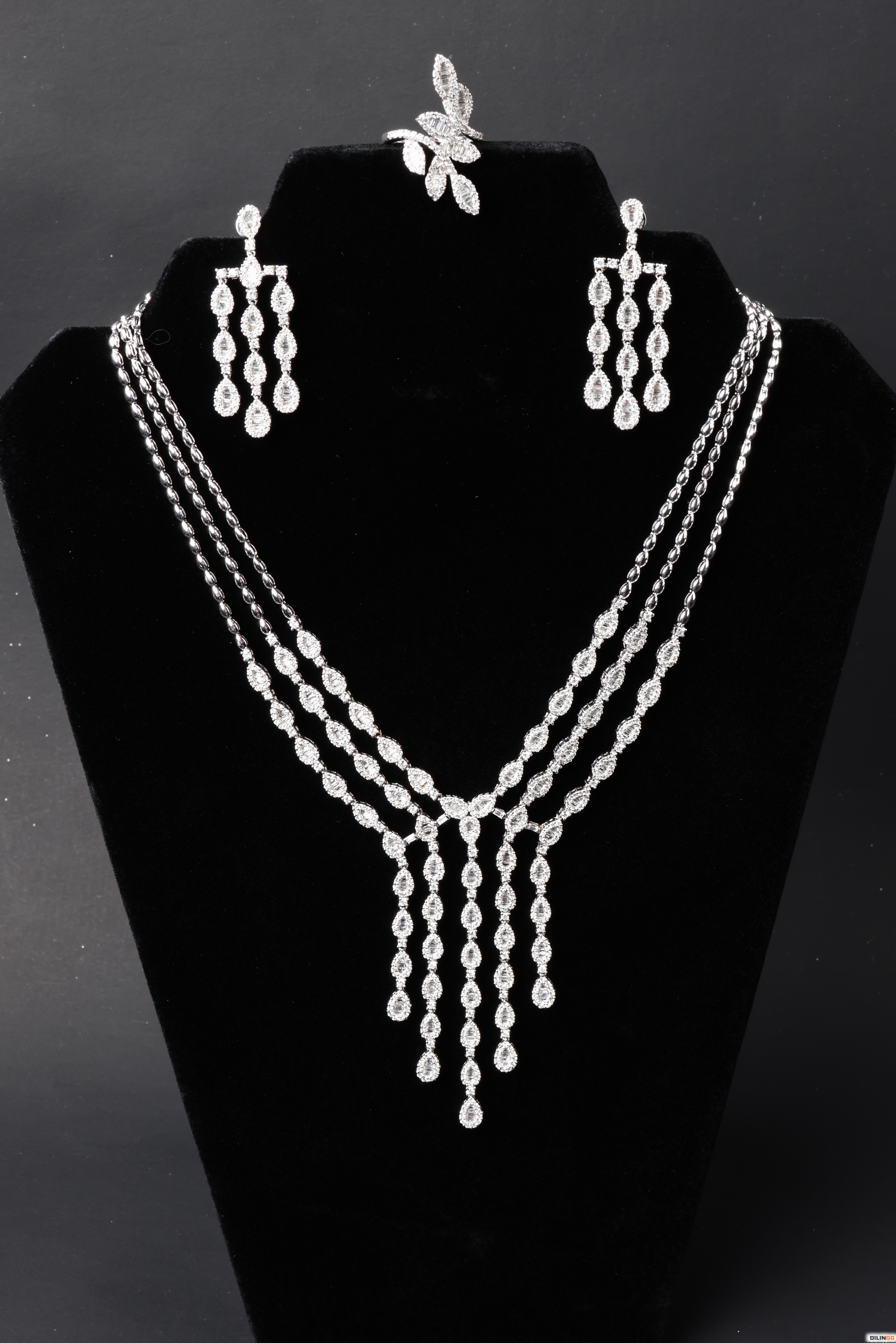 Гарнитур: колье ,серьги , кольцо-комплект. Общая масса 83.25 грамм. Изделие из белого золота. Пробное клеймо иностранного государства. Изделие высокой сложности .Качество изготовления-превосходное. Степень износа отсутствует.